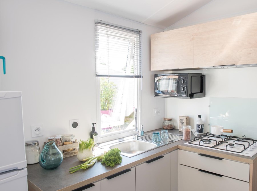 Dieses kleine Mobilheim für 2/3 Personen, mit Klimaanlage, TV und 1 Schlafzimmer, ist ideal für Paare oder Familien mit einem Kind unter 10 Jahren.